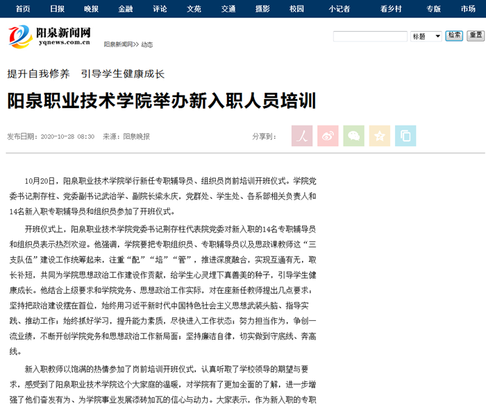 10月20日,陽泉職業技術學院舉行新任專職輔導員、組織員崗前培訓開班儀式。學院黨委書記荊存柱、黨委副書記武治學、副院長梁永慶,黨群處、學生處、各系部相關負責…