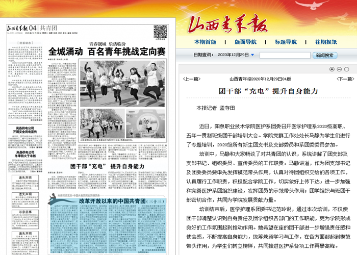 近日,陽泉職業技術學院醫護系團委召開醫學護理系2020級高職、五年一貫制班級團干部培訓大會。學院黨群工作處處長馬靜為學生們進行了專題培訓,2020級所有新生團支…
