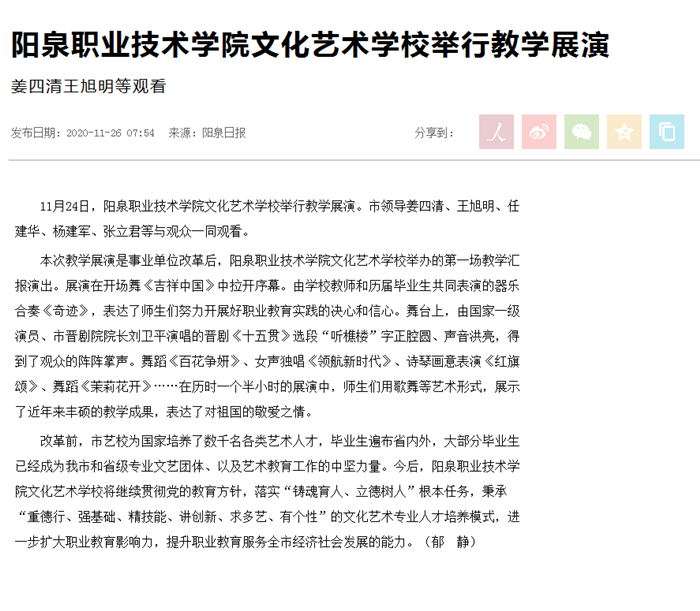 11月24日,陽泉職業技術學院文化藝術學校舉行教學展演。市領導姜四清、王旭明、任建華、楊建軍、張立君等與觀眾一同觀看。 本次教學展演是事業單位改革后,陽泉…